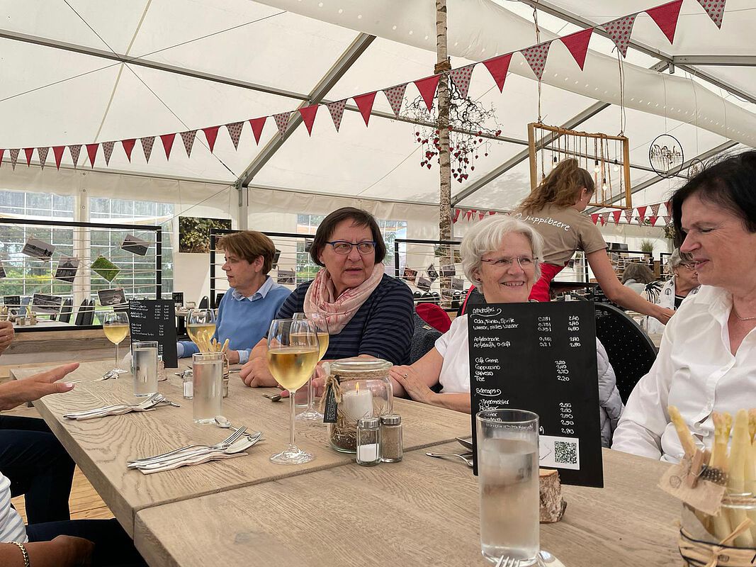 Unsere diesjährige Spargeltour mit 47 AWO-Reisefreunden führte uns nach Selfkant, in der Nähe von Heinsberg. Der Spargelhof Hensgens ist ein Familienbetrieb in 4. Generation und liegt im westlichsten Zipfel Deutschlands, direkt an der niederländischen Grenze. Bei der Ankunft wurden wir mit einem Glas Secco auf dem Hof freundlich empfangen. Anschließend hatten wir eine ca. halbstündige Führung im Hofgebäude mit Informationen zum Spargel, Erdbeeren und Heidelbeeren. Alles wird hier angebaut und wie vor 60 Jahren von Hand geerntet. Hier erfuhren wir von dem Sohn des Hofes, dass der Spargel im Frühjahr bei einer Bodentemperatur von 12 Grad Celsius langsam zu wachsen beginnt. Um die Triebe vor Sonnenlicht zu schützen, wird ein Damm über die Pflanzen aufgefahren und mit Folien abgedeckt. Die Folie lässt den Damm im Frühjahr leichter erwärmen und schützt den Damm vor dem Austrocknen. Die Erde bleibt feucht und locker. Die Spargelernte ist schwere körperliche Handarbeit. Jede Stange wird einzeln ausgegraben und gestochen. Nach dem 24.06. lässt man die Pflanzen wachsen und zu Kräften kommen für das nächste Jahr. Nach 8 Jahren muss das Spargelfeld neu angelegt werden. Der Betrieb beschäftigt 300 Saisonarbeitskräfte, meist polnische, ukrainische und rumänische Erntehelfer. Der Hof vermarktet den Spargel selbst und kann so den Preis selbst bestimmen. Das Sortieren des Spargels geschieht maschinell. 5 bis 6 Fotos pro Spargelstange, danach automatische Spargelsortierung. Die ideale Spargelstange ist gerade, hat ein geschlossenes weißes Köpfchen und einen Durchmesser von 20 bis 26 mm. Zum Hof gehören auch große Erdbeerfelder. Die Erdbeeren werden auf Foliendämmen angebaut, in denen eine Tropfbewässerung verlegt wurde. So werden die Pflanzen mit Wasser versorgt, Regen ist nicht nötig. Die leckersten Erdbeersorten vom Hof, die Juppibeeren, sind süß und haben weiches Fruchtfleisch. Nach der Führung wurde das Spargelbuffet für uns in einem großen Zeltpavillon eröffnet. Wir waren an diesem Tag die einzige Gruppe und somit ungestört. Hausgemachte Spargelcremesuppe, Salate, gekochter und roher Schinken, Spargel, Sauce Hollandaise und zerlassene Butter, Schweineschnitzel, Putenbraten und Dessert mit Juppibeeren. Alles war sehr köstlich und reichhaltig. Es hat allen sehr gut geschmeckt. Nach dem Essen konnte man die Sonne draußen auf den Bänken genießen und im schönen Hofladen einkaufen. Weiter ging die Fahrt nach Roermond. Hier starteten wir eine gut einstündige Schiffsrundfahrt auf der Maas mit Kaffee und Kuchen. Auf dem kleinen Schiff waren keine weiteren Fahrgäste. Die Fahrt ging an verschieden Yachthäfen vorbei und der „Marina Oolderhuuske“, einem Feriendorf aus schwimmenden Ferienhäusern. Leider war das Wetter nicht mehr so schön, um die Fahrt auf Deck zu genießen. Eine Gruppe von 10 Personen hat anstelle der Schiffstour einen Stadtbummel in Roermond unternommen. Danach ging es zurück nach Langenfeld. Es war ein abwechslungsreicher Tag mit vielen Eindrücken, leckerem Essen, Geselligkeit und Vorfreude auf neue Touren.