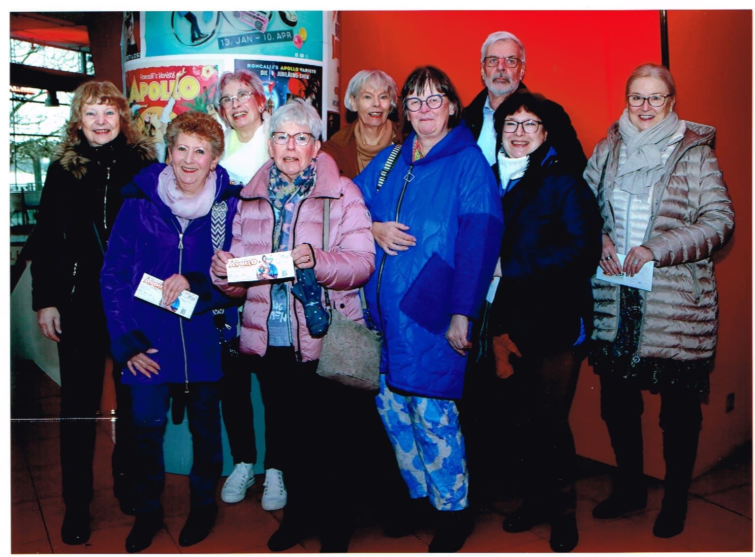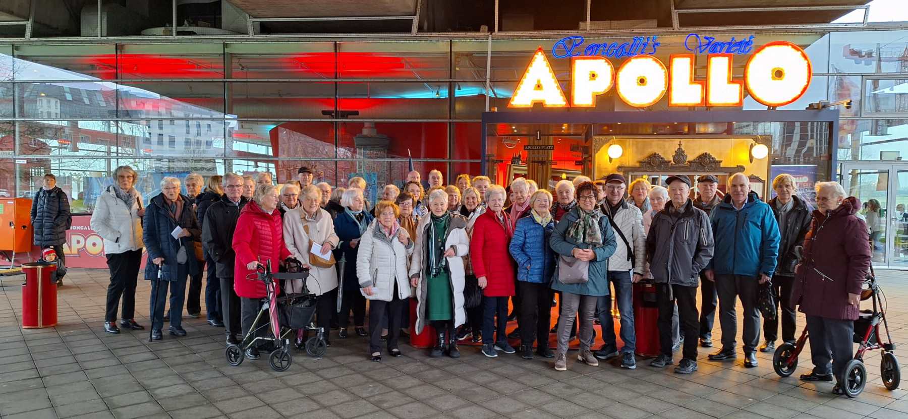 AWO Tagesfahrt zum Roncalli`s Apollo Varieté Düsseldorf Am Sonntag, dem 04. Februar 2024, fuhren wir mittags mit 60 Senioren nach Düsseldorf ins Apollo Theater. Mit dem großen Reisebus und dem kleinen AWO-Bus waren wir schnell am Ziel. Nach einem kleinen Fußweg versammelten wir uns zu einem Gruppenfoto vor dem Eingang. Das Apollo Varieté besteht in Düsseldorf seit 17.10.1997. Vom Foyer und Restaurant hat man einen herrlichen Panoramablick auf den Rhein und die Uferpromenade von Düsseldorf. Es bietet 4 x jährlich wechselnde Shows mit Akrobatik, Tanz, Life-Musik und Comedy. Zusätzlich wechselnde Sonderveranstaltungen und Gastspiele. Vor Beginn der Vorstellung blieb genug Zeit, um alle Plätze im Parkett einzunehmen. An den Tischen, jeweils für sechs Personen, bekamen wir leckeren Kaffee und Kuchen. Pünktlich um 14.00 Uhr begann die Vorstellung „Sunset Strip, Die 80s Rock Show“. Ein abwechslungsreiches Programm mit phantastischen Künstlern und Tänzern aus verschiedenen Ländern und einer hervorragenden Band mit toller Musik und Gesang. Wir sahen Akrobatik und Saltos mit dem Sprungbrett, Zaubereien mit Glas und Flaschen, Künstlerin mit Hula-Hoop-Reifen und traumhafte, gefühlvolle Paar-Akrobatik am Seil. Ein Künstler balancierte mit einem Brett auf einer sich bewegenden Rolle auf einem hohen Gestell. Mit sieben weiteren Aufbauten wurde es immer höher, ein beeindruckender Auftritt. Eine gläserne Badewanne gefüllt mit Wasser, eine tolle Darbietung mit Seilakrobatik, da die Badewanne zum Eintauchen genutzt wurde. Zum Abschluss Vater und Sohn aus Brasilien mit einer atemberaubenden Darbietung. Sohn kopfüber auf dem Kopf des Vaters mit weiteren Balanceaktionen. Jeder Auftritt wurde begeistert verfolgt und die Künstler mit viel Applaus belohnt. Zwei Comedians führten lustig durch die Vorstellung. Es wurde herzhaft gelacht. Nach mehr als zwei Stunden war die Vorstellung leider zu Ende. Unsere Busse brachten alle Senioren glücklich nach Langenfeld. Möchten auch Sie mit uns einen schönen Tag verbringen? Anmeldungen gerne beim Reiseteam, donnerstags in der Zeit von 14.00 bis 17.00 Uhr, Solinger Str. 111, 40764 Langenfeld, Tel. 02173 1600008 (AB). Petra Clemens