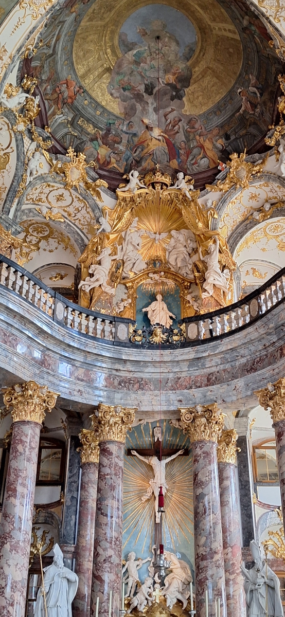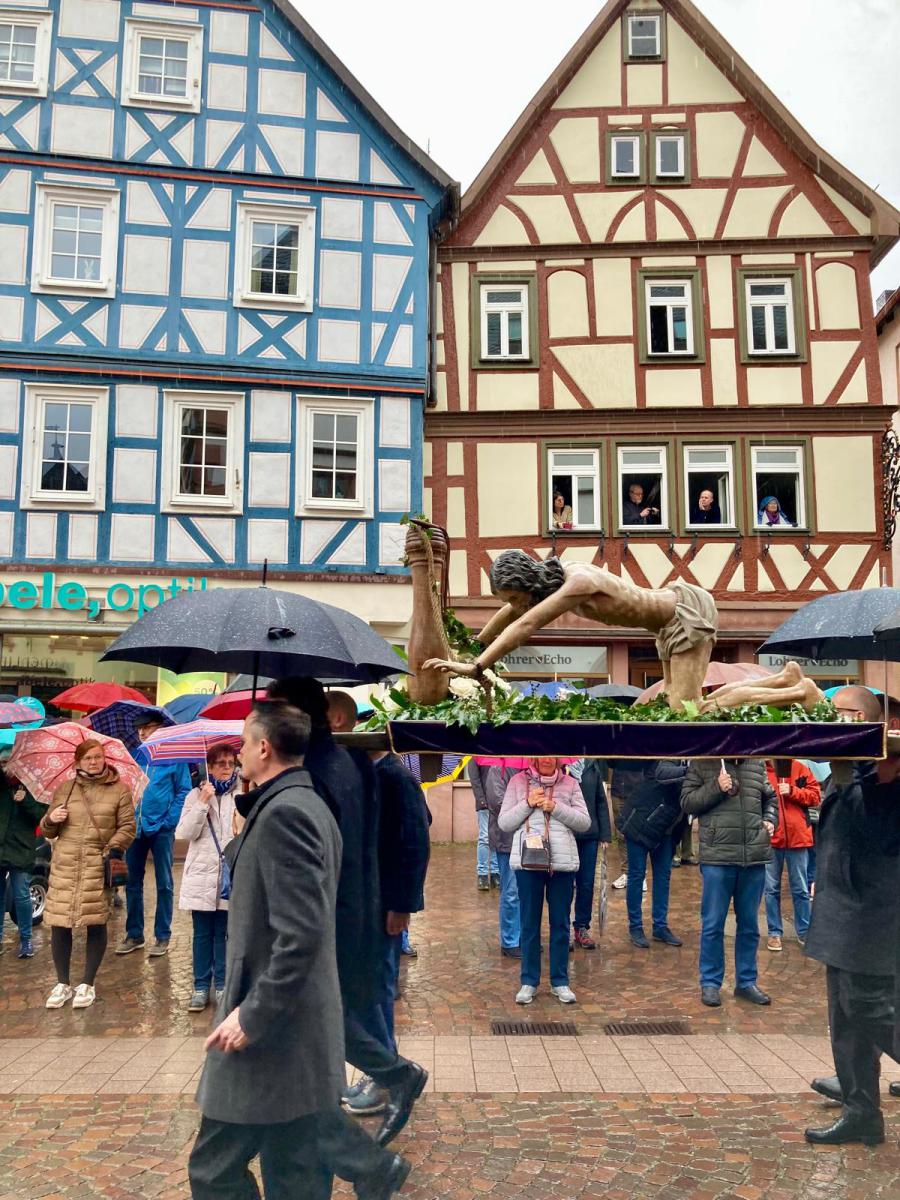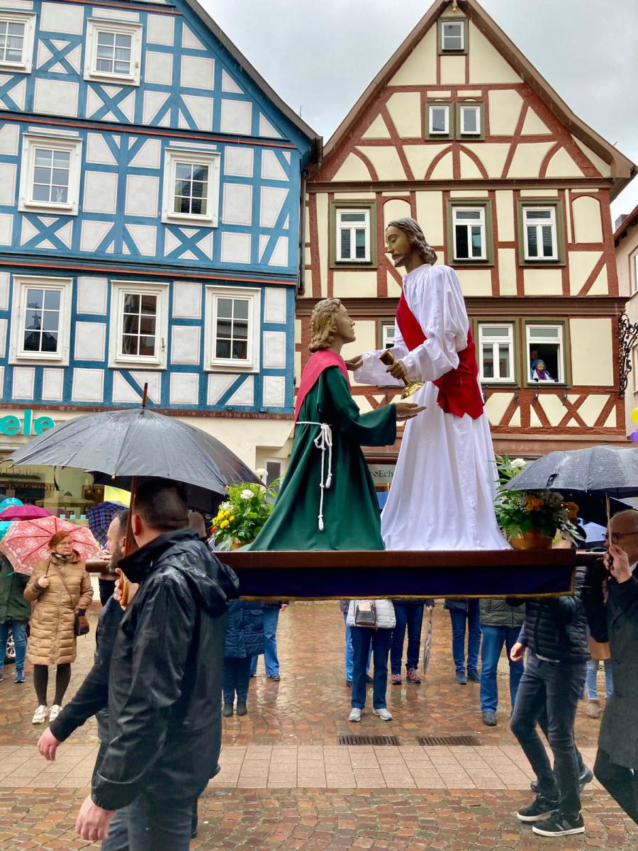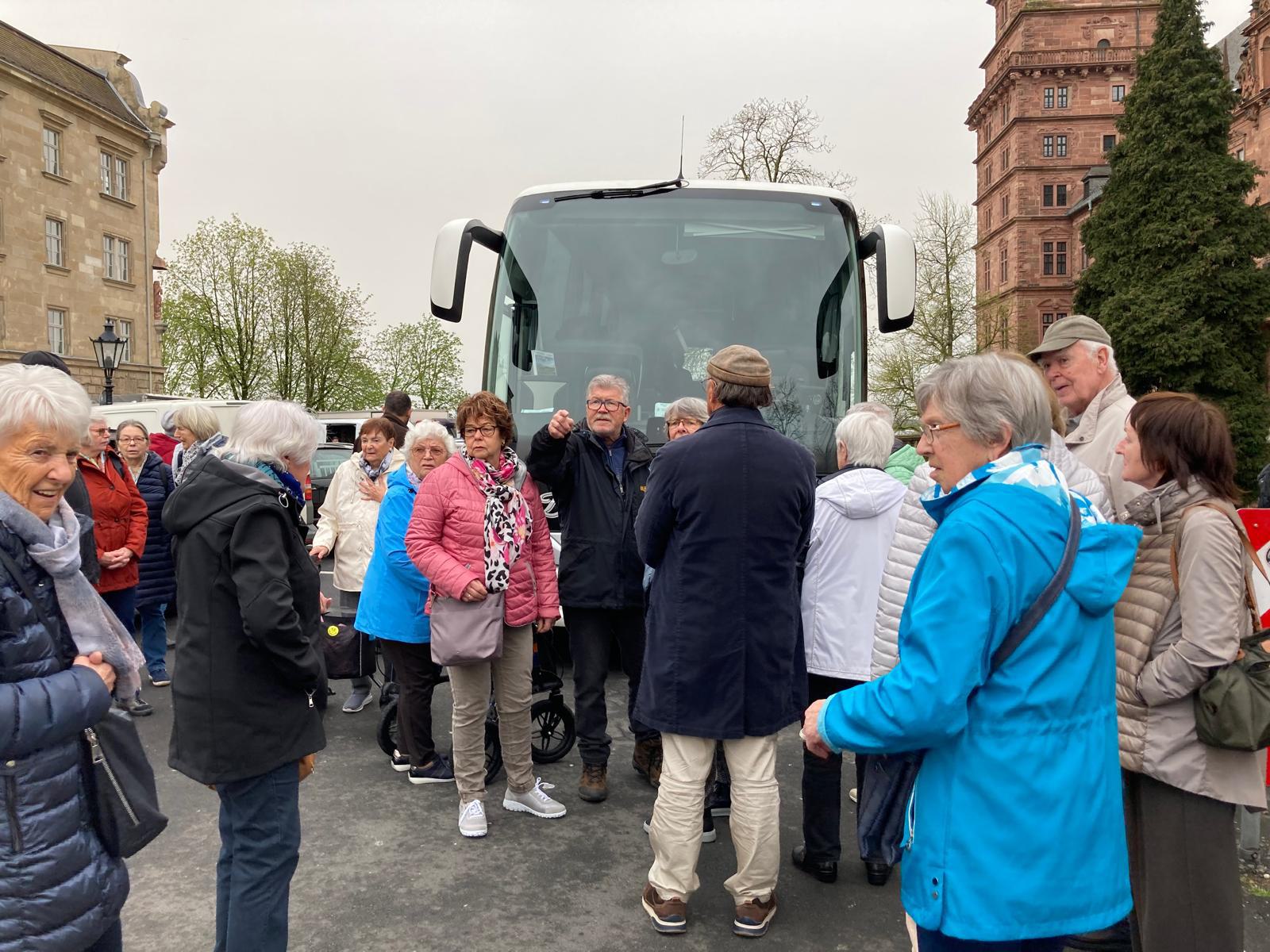 Am Donnerstag, den 28. März 2024 fuhren die AWO-Reisefreunde gemütlich in den Spessart um bei einem ersten Halt auf dem Parkplatz Moseltalbrücke ein kleines Frühstück mit Kaffee, Sekt, Muffins und leckeren Schinkenhappjes zu sich zu nehmen. So gestärkt ging es weiter nach Seligenstadt. Auch hier konnten wir gleich wieder neue Leckereien entdecken: Speisen in Dosen wie z.B. saure Nierchen. Viele der Gäste haben gleich zugegriffen und einen Vorrat für zu Hause gekauft. Der Ort war übersichtlich und bei einem Spaziergang konnten wir die vielen schönen Fachwerkhäuser und die tolle Landschaft bewundern. Im Anschluss waren unsere Zimmer bezugsfertig und wir haben uns später zum ersten Abendessen im Hotel getroffen. Das Essen war jeden Tag vorzüglich - immer ein 4-Gänge Menü mit Salat, Suppe, einem tollen Hauptgericht aus der Region und leckerem Nachtisch. Am Karfreitag fuhren wir nach einem Frühstück, das keine Wünsche offen ließ, zur Karfreitagsprozession nach Lohr am Main. 1658 wurde die Prozession erstmals urkundlich erwähnt, heute zählt sie zum Weltkulturerbe. 13 lebensgroße Holzfiguren wurden bei strömendem Regen durch den Ort getragen. Es war ein ergreifendes Erlebnis, welches auch vom Bayrischen Rundfunk übertragen wurde. Anschließend begleitete uns der Reiseleiter Eddy zu einer Stadtführung nach Wertheim und noch ein wenig weiter durch den Spessart. Am Abend spielten wir Bingo, wie immer mit tollen Preisen z.B. Essensgutscheinen. Am Samstag, den 30. März ging unsere Fahrt nach Augsburg. Hier gaben es eine Schlossbesichtigung und anschließend ein Bummel durch die Altstadt. Dort fanden wir auch das älteste Gasthaus Deutschlands aus dem Jahr 1550. Wir besuchten das Schloss Mespelbrunn, das wir leider nur von außen bewundern konnten. Nächster Stopp war Aschaffenburg. Dort ging es über den Marktplatz zum Schloss. Reiseleiter Eddy hatte einiges über das Schloss zu erzählen und die Senioren hörten interessiert zu. Auf der Heimfahrt zum Hotel verriet uns unser Busfahrer Christoph, dass es eine Überraschung geben würde. Wir wurden in die Lounge geführt und dort von Räubern empfangen, die anschließend ein Schauspiel aufführten und die Gäste mit in das Spiel einbezogen. Frau Schäfer wurde die Ehre der Räuberbraut mit Kränzchen und Ehering zuteil. Zu ihrem Bedauern musste sie aber beides wieder abgeben. Karl-Horst befreite eine Dame aus den Händen der Räuber und alles nahm ein gutes Ende. Unser Reiseleiter hatte auch einen Part bei der dem originelle Spessarträuberüberfall und es gab für jeden ein Osterschnäpschen, was die Stimmung noch mehr hob. Lachend ging es dann zu dem wieder einmal vorzüglichen Abendessen. Am Ostersonntag stand die Besichtigung der Residenz Würzburg mit Hofkirche und Dombesichtigung sowie einem Stadtrundgang auf dem Programm.Die Fahrt auf dem Main war sehr interessant, man sah Burgen und auch das Schloss Staffelstein, wohin wir am Ostermontag zum Ostermarkt wollten. Die Sonne schien und wir peilten Veitshöchheim mit seinem Barockgarten und dem Biergarten an. Die Fürsten lustwandelten früher mit den Damen durch die Laubengänge und wurden von niemanden gesehen. Am Ostermontag besuchten wir den Ostermarkt auf dem Schloss, und es gab noch schöne Kleinigkeiten für jeden zu kaufen.