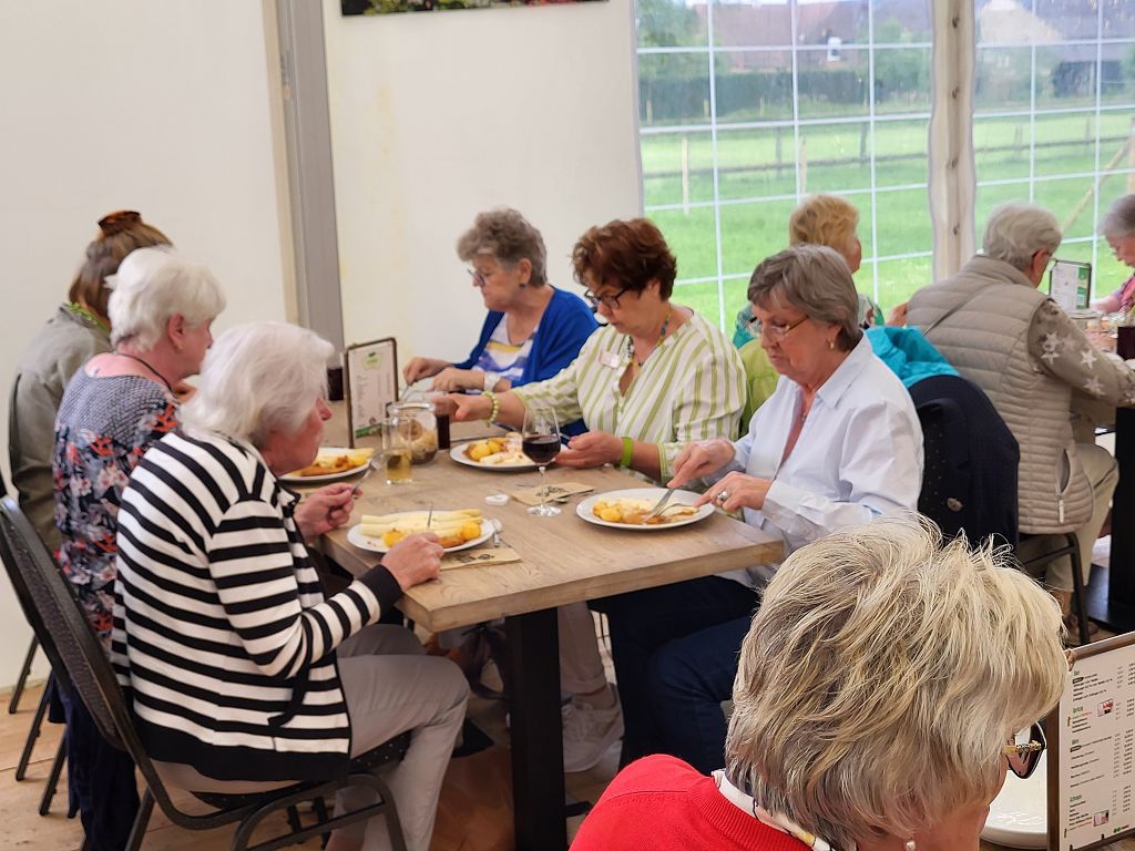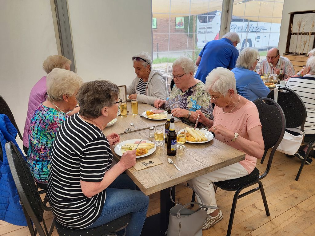 Am Mittwoch, dem 15.05.2024 machte sich ein Bus voller reiselustiger Senioren auf den Weg zum Spargelhof von Arne Hensgens – bekannt als „Juppis Hof“ in Selfkant. Wir waren bereits gegen 11:00 Uhr vor Ort und hatten somit Gelegenheit, für die Daheimgebliebenen (oder auch für uns selbst) einige Leckereien zu erstehen. Es gab frischen Spargel, alles was zu Spargel gehört (Kartoffeln, Schinken usw.), Spargelsuppe in der Flasche, aber auch frische Erdbeere, Erdbeeren mit Schokolade, und viele nette Kleinigkeiten um das Zuhause zu verschönern. Ein bisschen zur Geschichte von „Juppis“ Hof: Seit vier Jahrzehnten steht Juppi für besten Spargel, süße Erdbeeren und leckere Heidelbeeren aus dem westlichsten Zipfel Deutschlands. Bereits seit rund einem Jahrhundert wird dort Landwirtschaft betrieben und Juppi ist untrennbar mit der Region Selfkant und ihrer wechselhaften Geschichte verbunden. Denn in den 1920er Jahren legte Josef Hensgens aus Hastenrath den Grundstein für den Familienbetrieb. Zu Beginn war der Hof ein landwirtschaftlicher Mischbetrieb, dessen Erzeugnisse und Produkte ihren Weg auch über die nahe, rund einen Kilometer entfernte, Grenze in die Niederlande fanden. Man munkelt, dies sei in manchen Fällen ohne die vorschriftsgemäße Entrichtung von Zöllen passiert. In einer Region, die mit einer „Butternacht“ Schlagzeilen machte, gewiss denkbar. Am Ende des Zweiten Weltkriegs war Deutschland zu Reparationszahlungen an die geschädigten Nationen verpflichtet. Das konnten Geldzahlungen aber auch Sachleistungen sein. Die Niederlande erhielten 1949 als Reparationszahlung u.a. die deutschen Ort Tüddern (ca. 4 KM von Juppis Hof entfernt) sowie den Grenzort Elten, die somit niederländisch wurden. Für die Bewohner änderte sich damit einiges. Sie erhielten z.B. einen Stempel in ihrem Pass mit der Aufschrift: „Wordt als Nederlander behandelt“ was bedeutet „Wird wie ein Niederländer behandelt“. Zum Verwandtenbesuch nach Emmerich z.B. wurde ein Visum benötigt. Es gab aber auch Vorteile: In Deutschland waren niederländische Kolonialwaren wie Kaffee oder Kakao Luxusartikel, die es in Elten reichlich gab. Im Zuge der Friedensverhandlungen zwischen der Bundesrepublik Deutschland und dem Königreich der Niederlande wurde Elten und die anderen Orte im Jahr 1963 wieder deutsches Staatsgebiet. Am Tag bevor die Orte wieder deutsch wurde, packte man alle Scheunen und Keller voll mit Waren: Kaffee, Spirituosen, Konserven, Schweine und jede Menge Butter. Aus den gesamten Niederlanden erreichten Lastwagen voller Butter den kleinen Ort. Denn mit der Rückgabe wurden auch die niederländischen Waren innerhalb des Ortes nachts um 12 Uhr deutsch, ohne dass Zoll erhoben wurde. Die Nacht vom 31. Juli auf den 1. August 1963 trägt seither den Namen „Butternacht“ … und so sagt man auch heute noch: Elten kam nicht heim ins Reich, sondern reich ins Heim. Dass die Zeiten sich änderten, ist in jedem Fall belegt: In den 1950er Jahren trat die zweite Generation an. Heinrich-Josef Hensgens übernahm den elterlichen Hof und schuf den Ackerbaubetrieb, der bis heute Bestand hat. Heinrich-Josefs Sohn Josef begann dann in den 1990ern damit, den Erdbeer- und Spargelanbau zu etablieren Gegen 11:30 Uhr ist es dann soweit und Fam. Hensgen präsentiert uns stolz die frischesten Produkte der Region. Das reichhaltige Spargelbuffet mit hausgemachten Spezialitäten erwartet uns und wir können nach Herzenslust schlemmen und genießen. Für jeden ist etwas dabei – Spargel und eine lecker Sauce Hollandaise, Schnitzel, Braten, gek. Schinken und Kartoffeln. Vorher natürlich eine leckere Spargelsuppe, Spargelsalat und als Nachtisch Griespudding mit Erdbeeren. Abgerundet werden konnte das alles mit einem leckeren Erdbeersecco oder etwas hochprozentigerem. Nach diesem reichhaltigen und leckeren Mittagessen war noch genügend Zeit für einen kleinen Spaziergang rund um die Felder oder in den kleinen, beschaulichen Ort. Gegen 14:00 Uhr machten wir uns noch einmal für eine halbe Stunde auf den Weg in Richtung Heinsberg. Hier erwartete uns ein besonderes Highlight: Eine exklusive Modenschau bei der Firma Marcienne. Wir erhielten hier einen Blick hinter die Kulissen und konnten uns anschauen, wie die Kleidungsstücke entstehen. Die Moderatorinnen präsentierten die neuesten Looks und Trends ihrer Kollektion, begleitet von passender Musik, Kaffee und Kuchen. Im Anschluss bestand die Gelegenheit im Verkaufsraum zu stöbern und anzuprobieren. Den vielen Einkaufstaschen nach zu urteilen, fand die Kollektion großen Anklang. Kurz nach 17:00 Uhr ging es Richtung Heimat, und dank unseres guten Busfahrers Karl-Heinz und der fast staufreien Autobahn waren wir schon vor 19:00 Uhr wieder in Langenfeld beim AWO Haus. Alle Teilnehmer waren sich einig: Das war wieder eine lohnenswerte Fahrt mit der AWO Langenfeld, wir freuen uns schon auf die nächste Tour!