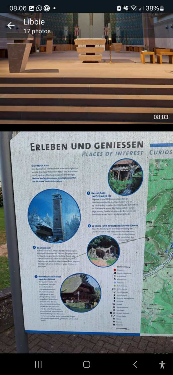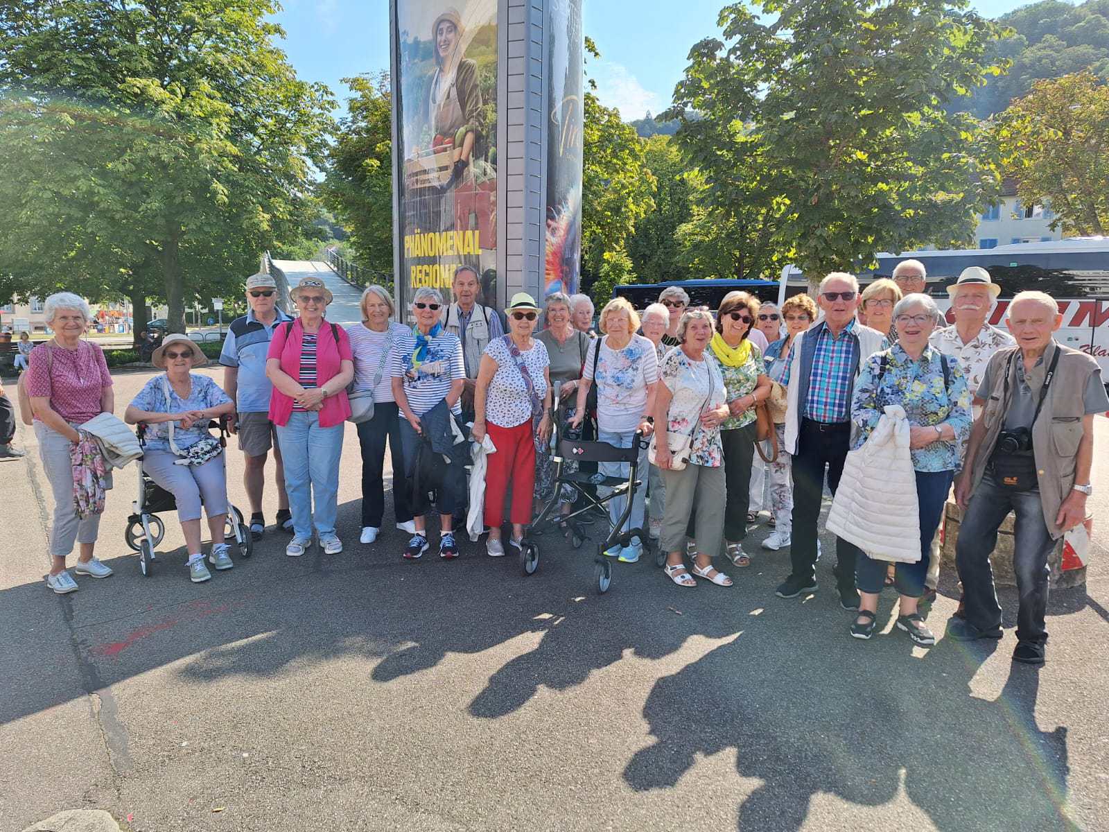 Wie immer gab es bei der Hinreise eine Frühstückspause, diesmal am Rastplatz „Moselblick“ mit herrlichem Blick auf die Mosel. Da mundete der Sekt und das Gebäck noch mal so gut. Es gab reichlich Kuchen, Kaffee und Snacks, damit man die Fahrt gut überstand – Essen hält ja bekanntlich Leib und Seele zusammen. Anschließend fuhren wir an unser Ziel, zum Hotel Bären in Oberharmersbach. Da ergab sich schon die erste Verwirrung = der Aufzug war defekt und die Fußkranken konnten nicht die Treppen hoch laufen, also wurde schnell umorganisiert und das Nebenhaus mit in Beschlag genommen. Zum Abendessen traf man sich dann zum 4-Gänge-Menü. Nach dem reichhaltigen Essen gingen einige ein wenig durch den kleinen Ort spazieren und man traf sich dann im Biergarten, wo es auch an 2 Tagen Live-Musik zum Mitsingen und Schunkeln gab. Das Essen war immer gut und reichhaltig. Am nächsten Tag fuhren wir nach Baden Baden, dort erwarteten uns 2 Stadtführer, die in 2 Gruppen die Stadt zu Fuß besichtigten. Als erstes ging es zum 1855 eingeweihten Spielcasino, leider durften wir nicht spielen. Es gibt dort pro Schicht 20 bis 25 Mitarbeiter. Während der Corona Zeit war die Spielbank das größte Impfzentrum mit 750 Impfungen am Tag. Im Hotel erwartete uns noch vor dem Abendessen das Seminar für Schwarzwälder Kuchen, der mit viiiiel Sahne gemacht wird. Den Abend ließen wir im hoteleigenen Biergarten gemütlich ausklingen. Am Mittwoch fuhren wir nach Freiburg, wo fast alle die Seilbahn auf den „Schauinsland“ bestiegen. Man hatte eine tolle Sicht bis in die Vogesen und über den Schwarzwald. Natürlich wurden auch die heimischen Spezialtäten wieder genossen, Kaiserschmarrn usw. Wieder auf dem Boden ging es weiter über den Reschenpass und die Schwarzwaldhochstraße zum Mummelsee. Dort hatte man die Gelegenheit um den See zu laufen und in der kleinen Kapelle einzukehren, wo gerade eine Andacht für Taubstumme stattfand, Es war Feiertag (Marie Himmelfahrt) und der Pater weihte Zweige. Die Kirchenfenster waren sehenswert. Den Abend verbrachten wir auf dem Rathausvorplatz, wo eine Trachtenkapelle aufspielte und Trachtengruppen ihre Tänze vortrugen. Es war wieder ein geselliger Abend. Am Donnerstag kam unser Reiseleiter Erwin zum Bus um mit uns durch den südlichen Schwarzwald zu fahren. Wir machten Rast in einer Schinkenräucherei, wo jeder gerne einkaufte, natürlich nur den echten Schwarzwälder Schinken. Unsere Fahrt führte uns dann nach Freudenstadt, wo wir die Innenstadt besuchten und Eis aßen .Über die Sasbachwaldener Badische Weinstraße fuhren wir nach Osteraus zur Schnapsbrennerei zur Verkostung und weiter nach Beiersbronn. Dann kam schon der Freitag und wir besuchten den Südschwarzwald mit der größten Schwarzwalduhr, wo noch jede Stunde der Kuckuck ruft. Es war wieder eine rundherum schöne Reise mit vielen netten Senioren.