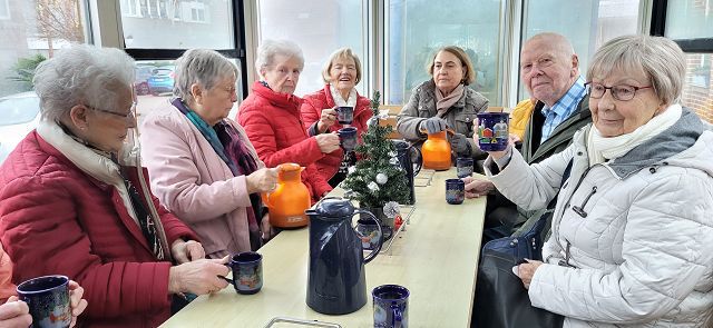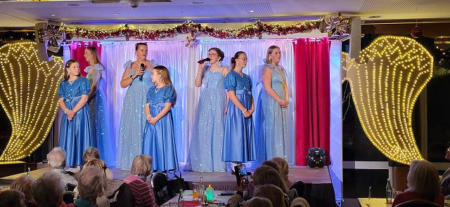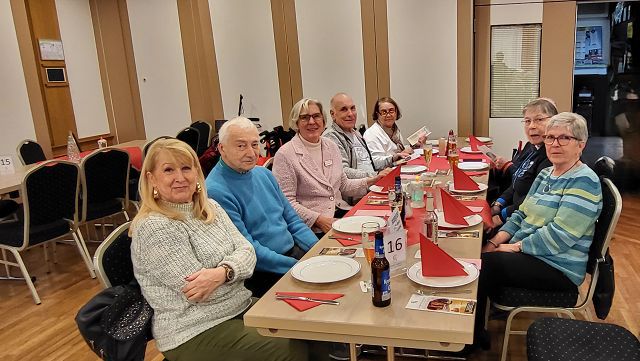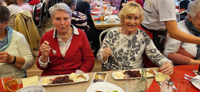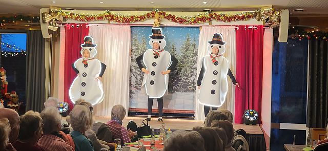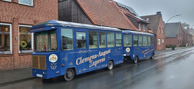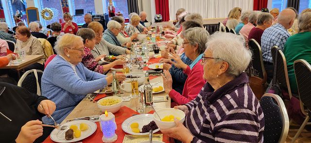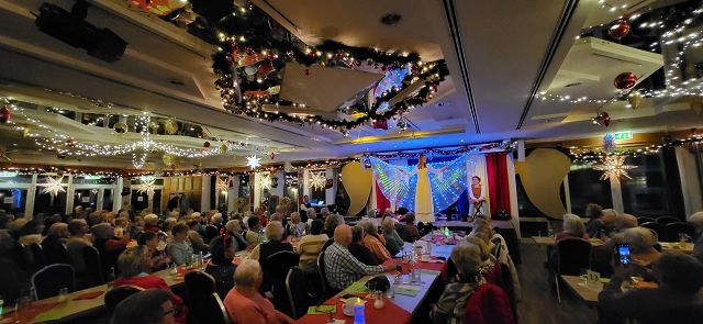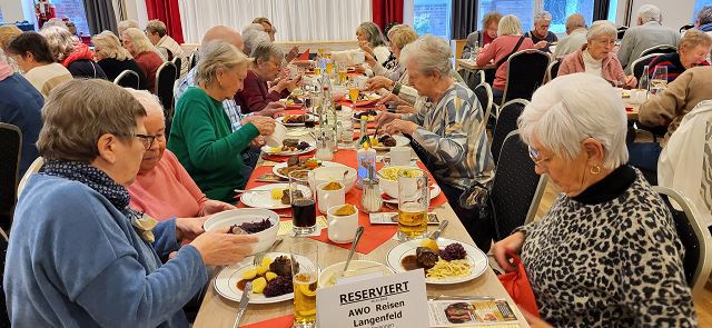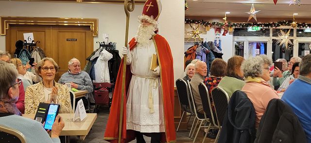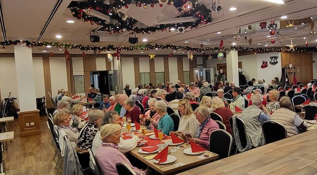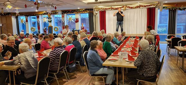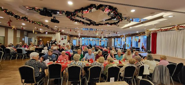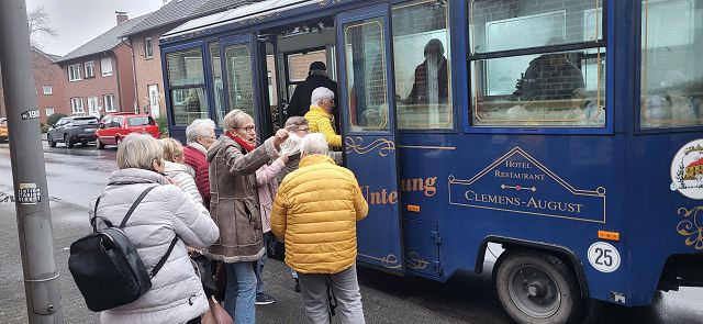 Um sich schon einmal auf die vor uns liegende Weihnachtszeit einzustimmen, machte sich am Dienstag, dem 25. November ein großer Bus voller reiselustiger Senioren auf den Weg nach Ascheberg ins Münsterland, um einen schönen Tag im Hotel Restaurant Clemens August zu verbringen. Einige hatten diesen Ausflug schon einmal mitgemacht und wussten so, was für ein schöner Tag vor uns lag.Wir konnten uns pünktlich auf den Weg machen und auch auf der Autobahn kamen wir ohne nennenswerte Staus gut vorn. Wie geplant, erreichten wir gegen 11:00 Uhr unser Ziel und wurden von Juniorchef Michael Stattmann begrüßt. Wie immer war alles gut organisiert, Garderobenständer waren nur für unsere Gruppe reserviert und durch unsere frühe Buchung hatten wir die besten Tische direkt vor der Bühne. Der Service war bestens und wir konnten sofort unsere Getränke bestellen. Unsere Abfahrt in Langenfeld war ja schon zeitig, und so haben sich alle auf das leckere Mittagessen um 11:30 Uhr gefreut. Es gab gefüllten Schweinebraten und Rinderrouladen nach Großmutters Art (mit Speck und Hackfleisch gefüllt), dazu entsprechende Soßen, Rotkohl, Kartoffeln und Spätzle. Von allem war reichlich vorhanden und wir haben richtig geschlemmt.Nach dem Mittagessen tat ein bisschen Bewegung gut und wir konnten die Einkaufsmöglichkeiten des Hotels in Augenschein nehmen. Es gab Leckereien wie hauseigene Spirituosen, Wurst von der Clemens-August-Landküche, selbstgebackenes Brot aber auch Weihnachtsdekoration, Schmuck, Taschen und andere Accessoires. Wer mochte, konnte auch schon einmal einen Glühwein auf der überdachten Terrasse genießen.Bevor die Weihnachtsfeier begann, hatten wir aber die Möglichkeit, eine 50-minütige Glühweinfahrt (es gab aber auch alkoholfreien Punsch) mit dem Weihnachtsexpress durch die Davert zu genießen. Dieses größte Laubwaldgebiet im Münsterland beherbergt viele seltene Tier- und Pflanzenarten.Zurück im Hotel nahmen wir Platz an unseren Tischen, denn nun gab es Kaffee oder Tee und ein Stück Hausmacher Torte.Um 16:00 Uhr war es dann so weit, und die Weihnachtsfeier konnte beginnen. Bei der Feier lernten wir die ganze Familie und einige der Mitarbeiten kennen. Der Senior konnte diesmal leider nicht mitwirken, da er nach einer OP noch nicht richtig fit war. Die Musik zu den Weihnachtsliedern hatte er aber vorab aufgenommen und so war er indirekt doch wieder dabei. Es wurden kleine Stücke aufgeführt, Geschichten erzählt und auch wir leisten unseren Beitrag, indem wir die Weihnachtslieder kräftig mitsangen.Zum Ende hin kam auch noch der Weihnachtsmann zur Bescherung. Für jeden Gast gibt es als nette Überraschung einen kleinen Tannenbaum mit LED-Licht und die Feier ging langsam ihrem Ende entgegen. Die größte Überraschung hatte sicher aber eine unserer Teilnehmerinnen. Sie feierte an diesem Tag ihren Geburtstag und der Weihnachtsmann gratulierte ihr und der ganze Saal brachte ein Geburtstagsständchen.Auch das Ende der Feier war gut organisiert und so gab es kein durcheinander beim Verlassen des Saals. Unser Bus stand ebenfalls bereit und wir konnten unsere Heimreise antreten. Auch bei der Rückfahrt hatten wir Glück und die Staus hielten sich in Grenzen, so dass wir wie versprochen um 20:00 Uhr am Dissmannhaus ankamen. Von allen kam Lob und man war sich einig, dass man diesen Ausflug jederzeit wieder machen würde.