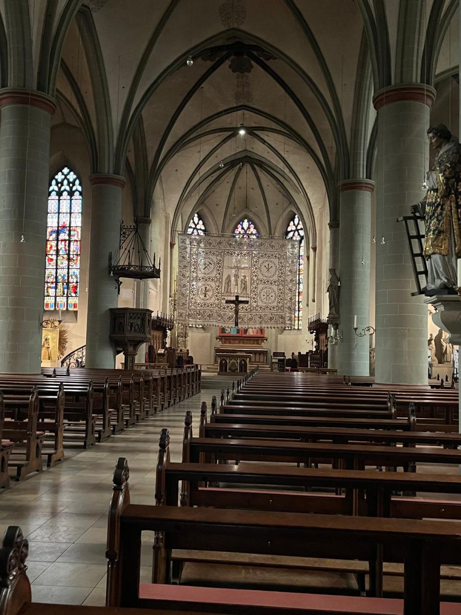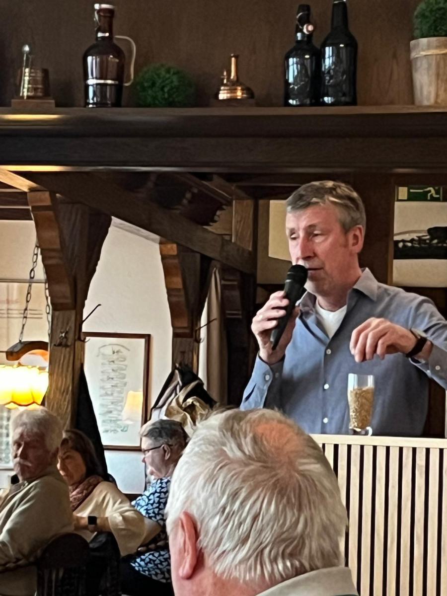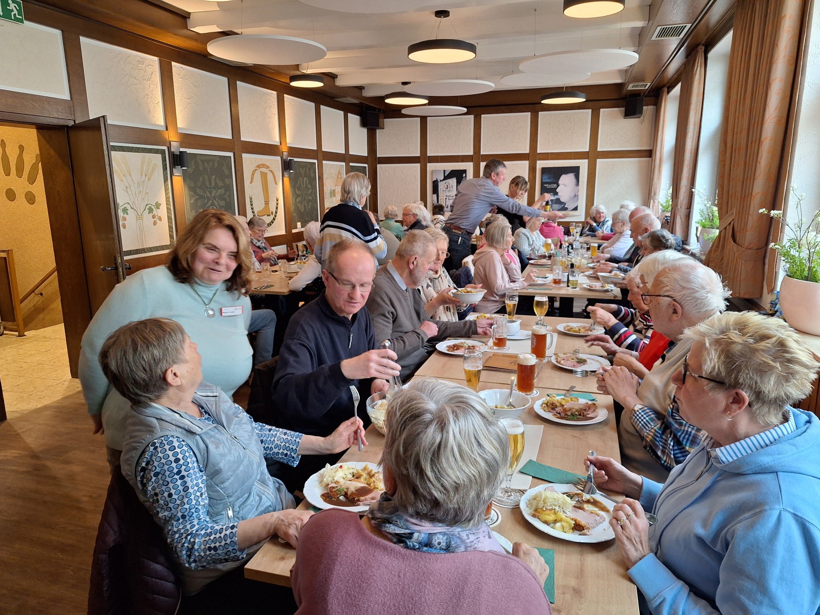Am 11. März 2026 fuhren wir mit 50 Seniorinnen und Senioren ins Münsterland. Unser Ziel war die idyllische Stadt Warendorf, die besonders für ihre bestens erhaltene historische Altstadt, ihre große Pferdetradition und der Warendorfer Hengstparade bekannt ist. Nach der 2-stündigen Busfahrt erreichten wir unser Ziel. Die Hälfte der Teilnehmenden nahm an einer interessanten Stadtbesichtigung teil. Gemeinsam mit einem Stadtführer erkundeten die Teilnehmer die gotische Kirche „St. Laurentius“ mit der „Schwarzen Madonna“. Sie erhielten interessante Einblicke in die Geschichte der Stadt. Warendorf war nicht vom Krieg zerstört und hat sich dadurch seinen historischen Charme bewahrt. Die zahlreichen gut erhaltenen Giebel- und Fachwerkhäuser prägen das Stadtbild. Gemeinsam mit dem Stadtführer führte der Weg über den Marktplatz und durch einige der schönen Gassen der Altstadt. Leider zeigte sich das Wetter an diesem Tag wenig freundlich, sodass der Rundgang zeitweise vom Regen begleitet wurde. Einige kauften sich eine süße Warendorfer Spezialität, handgerollte Schokoladentrüffel aus edler Vollmilch- oder Zartbitterschokolade, traditionell in einem mit Stroh ausgelegten Einmachglas. Die andere Hälfte der Gruppe besuchte das bekannte Nordrhein-Westfälische Landgestüt. Dort erhielten wir Einblicke in die traditionsreiche Pferdezucht und die Arbeit mit den Pferden. Das Gestüt wurde 1826 gegründet und feiert in diesem Jahr ihr 200-jähriges Bestehen. Mit 65 Mitarbeiterinnen und Mitarbeitern sowie 20 Auzubildende ist es eines der größten staatlichen Gestüte Europas. Die prächtigen Stallungen mit ihren wunderschönen alten Kreuz- und Tonnendecken konnten wir besichtigen. Besonders beeindruckend war es, die vielen verschiedenen Hengste zu sehen – sowohl elegante Warmblüter als auch kräftige Kaltblüter. Einige Kaltblüter wurden sogar von draußen in ihre Boxen geführt. Dabei konnten wir alles nah miterleben. Es war zu beobachten, wie ruhig und gelassen die großen, stämmigen Pferde von den Pflegern in die Boxen geführt wurden. Die Pferde werden hier sorgfältig ausgebildet, damit sie später in verschiedenen Bereichen und auf Turnieren eingesetzt werden können. Einige werden für das Dressurreiten, das Springen oder speziell für Rennen trainiert. Diese Rennpferde können bei einem Rennen Strecken von bis zu 2400 Metern zurücklegen. Dabei erreichen sie eine durchschnittliche Geschwindigkeit von etwa 50 Kilometern pro Stunde und können kurz vor dem Ziel sogar Geschwindigkeiten von bis zu 60 Kilometern pro Stunde erreichen. Außerdem konnten wir miterleben, wie gerade zwei Stuten künstlich befruchtet wurden. So hatten wir einen spannenden Einblick in die moderne Pferdezucht. Ein weiteres Ziel unseres Ausflugs war die Stadt Beckum. Dort besuchten wir das traditionsreiche Brauhaus Stiefel-Jürgens – die älteste Brauerei Westfalens, seit 9 Generationen. In diesem gemütlichen Brauhaus wird das Bier noch direkt vor Ort gebraut und auch ausschließlich nur dort ausgeschenkt. Über steile Stufen gelangten wir in den kleinen Keller, wo wir die Brauerei kurz besichtigen konnten. Insgesamt werden hier etwa 25.000 bis 30.000 Liter Bier im Jahr gebraut. Es werden drei verschiedenen Biersorten angeboten. Dazu gehört Kölsch, naturtrüb Dunkel und ein Pils, das „Stefanus-Bräu“. Zusätzlich ab 01.05. das Weizenbier, im Winter das „Stiefel-Winter Bräu“ und ein Kellerbier, ein „naturtrübes Pils“. Zum Mittagessen wurde uns ein „Gambrinus-Teller“ mit herzhaftem Grillschinken, knusprigen Bratkartoffeln, einem leckeren Krautsalat sowie einer köstlichen Biersauce serviert. Dazu erhielten wir drei Freigetränke, sodass jeder in gemütlicher Runde ein frisch gebrautes Bier probieren konnte. Aufgrund des Regens auch am Nachmittag, verzichteten viele auf einen Gang in die Stadt Beckum. So verbrachten wir in geselliger Atmosphäre einige schöne Stunden, bevor unsere Fahrt wieder nach Langenfeld ging. Es war wieder ein schöner Ausflug und die Teilnehmenden freuen sich bereits auf das nächste gemeinsame Erlebnis. Text: Petra Clemens Fotos: Petra Clemens und Angela Schiffer