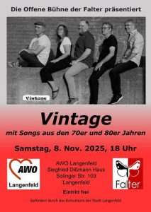 das nächste Konzert der Offenen Bühne verspricht wiederum viele bekannte Songs aus den 70er und 80er Jahren. VINTAGE sorgt für einen unverwechselbaren Sound, authentisch und mitreißend. Die Band covert und interpretiert viele bekannte Songs in ihrem eigenen unverwechselbaren Stil. Bestimmend ist der Spaß und die Freude, diese Musik zu spielen. Die Songs laden sowohl zum Zuhören als auch zum Tanzen ein. Die FALTER-Gruppe freut sich auf einen regen Besuch.