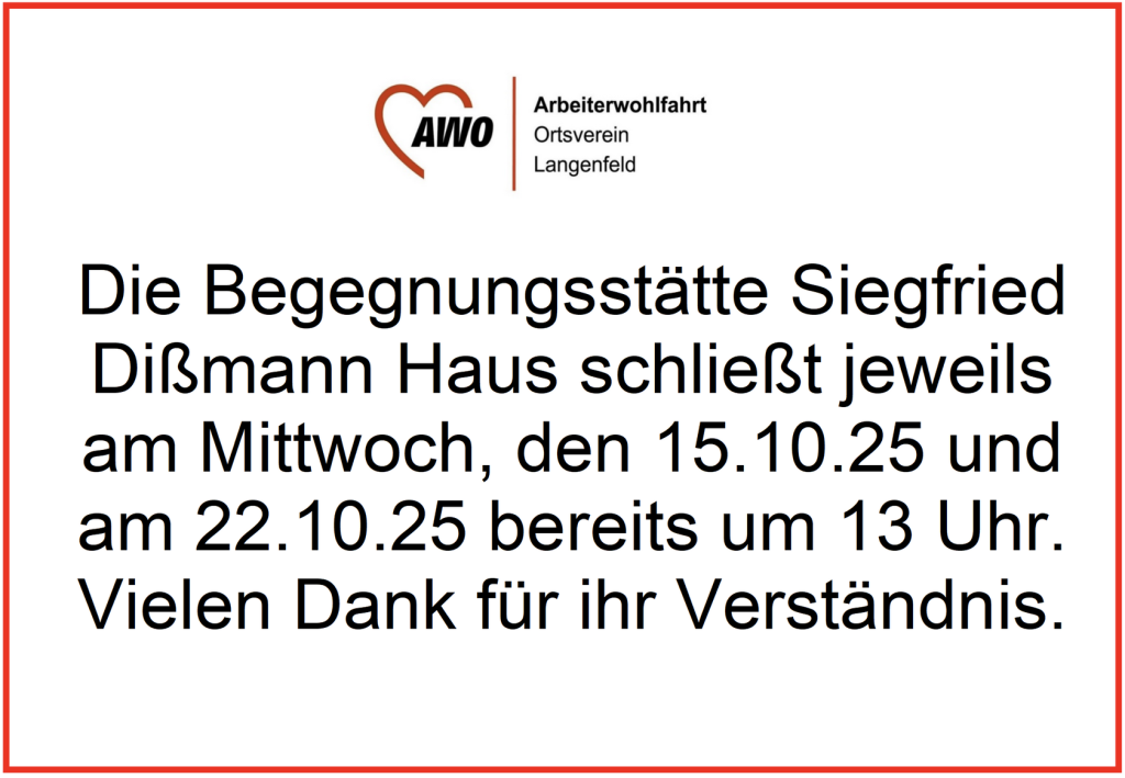 Siegfried Dißmann Haus am 15.10.25 und 22.10.25 ab 13:00 Uhr geschlossen